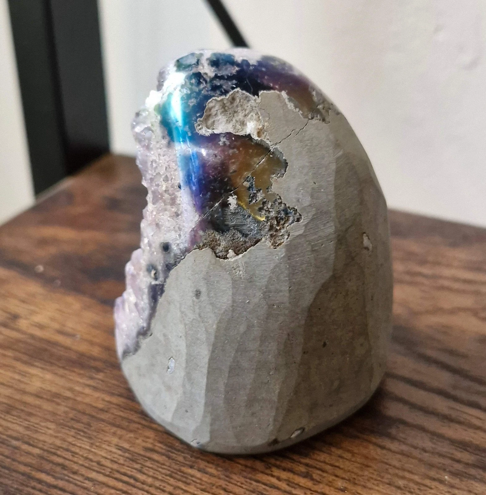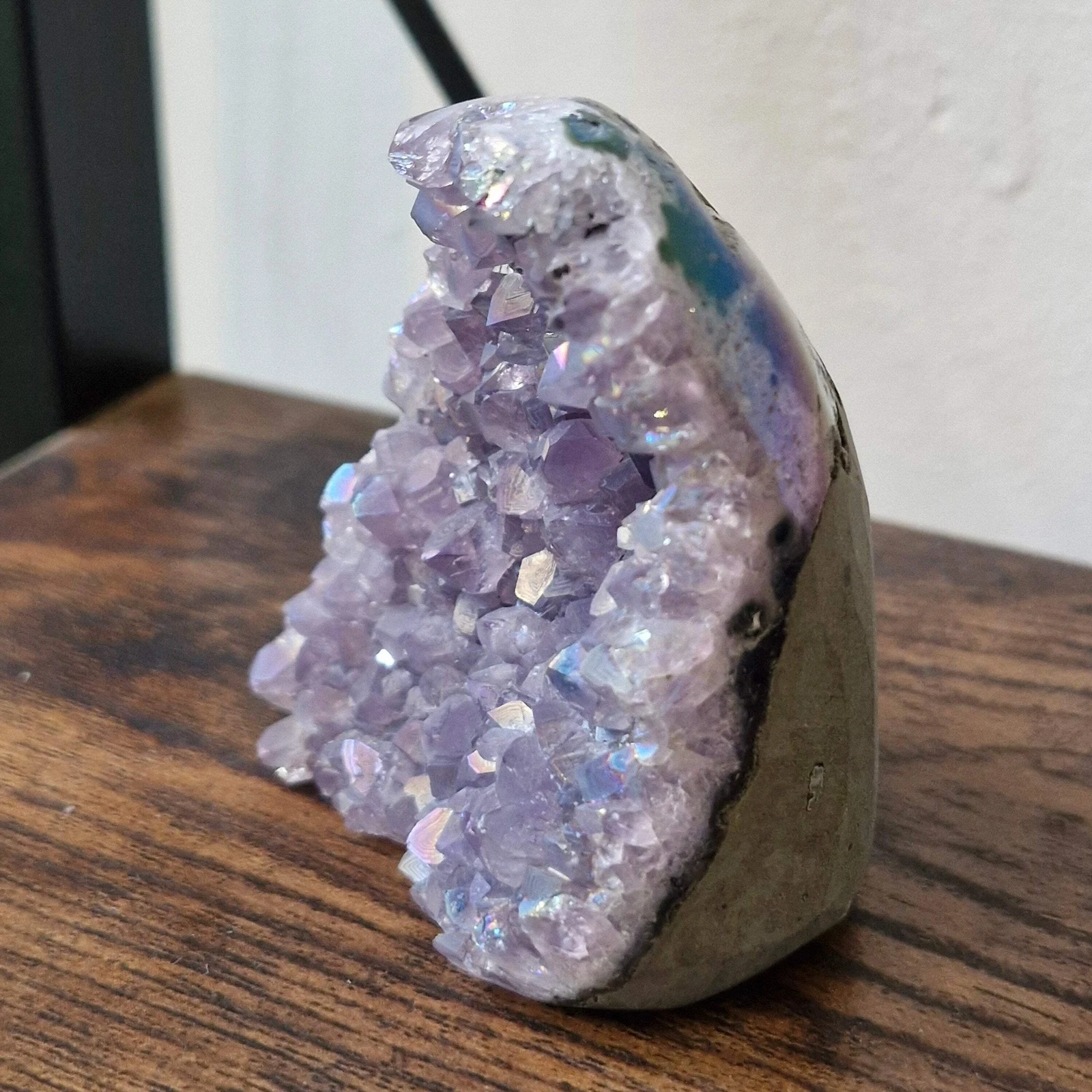 Aura amethyst is believed to amplify the natural calming properties of amethyst with the high-frequency energy of the bonded metals.