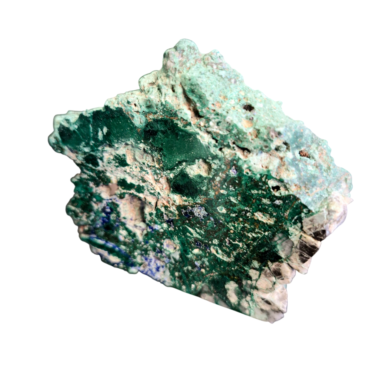 This product is a polished freeform slab of natural malachite and azurite crystals, originating from the Democratic Republic of Congo.